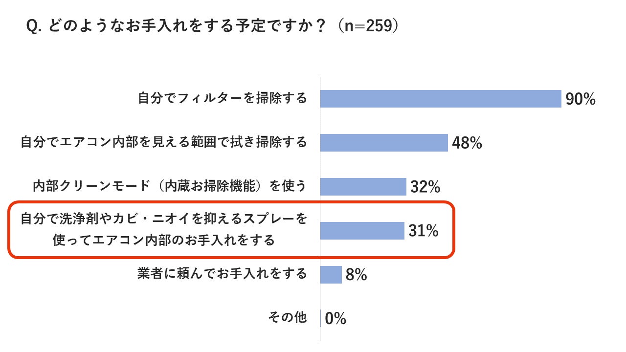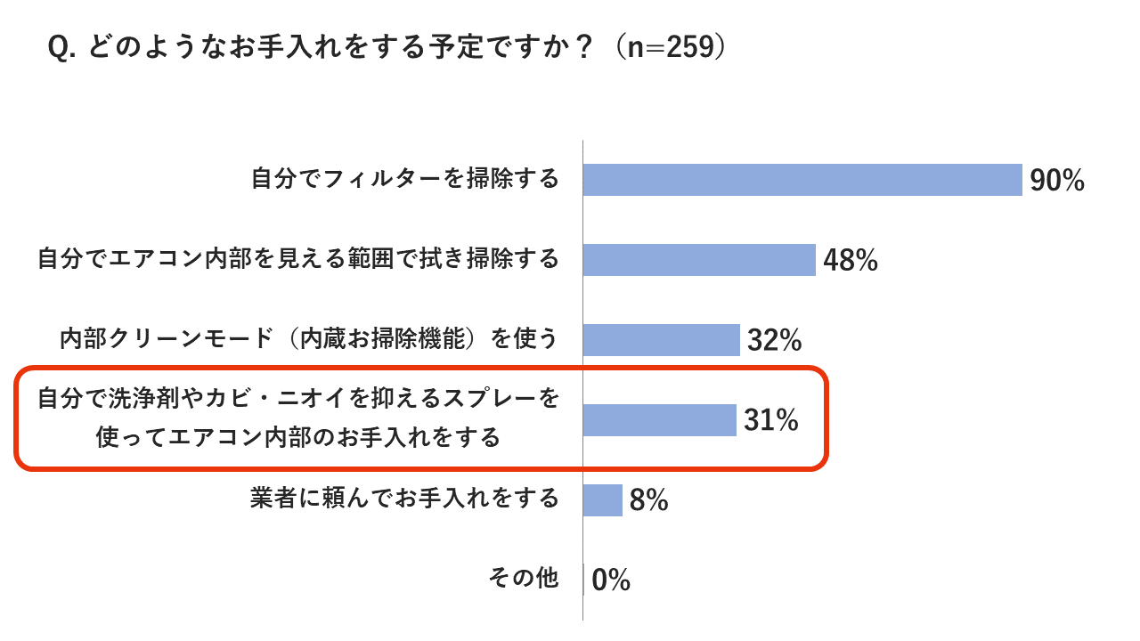 らに、夏じまいの予定が「ある」と回答した方に、どのようなお手入れをする予定かをたずねたところ、「自分でフィルターを掃除する」(90%)、「自分でエアコン内部を見える範囲で拭き掃除する」(48%)、「内部クリーンモード(内蔵お掃除機能)を使う」(32%)が上位3つの回答に。一方、「自分で洗浄剤やカビ・ニオイを抑えるスプレーを使ってエアコン内部のお手入れをする」方が約3割いることがわかりました。しかし、これは間違ったお手入れ方法で、内部に残った洗浄剤で故障の原因につながる恐れがあります。
