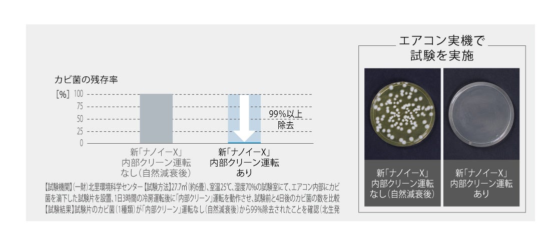 *2:【試験機関】(一財)北里環境科学センター【試験方法】27.7㎥(約6畳)、室温25℃、湿度70%の試験室にて、エアコン内部にカビ菌を滴下した試験片を設置、1日3時間の冷房運転後に「内部クリーン」運転を動作させ、試験前と4日後のカビ菌の数を