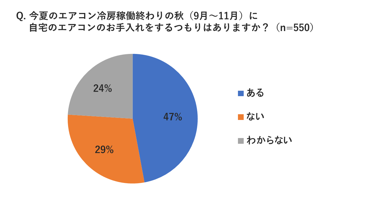 今夏のエアコン冷房稼働終わりの秋に、自宅のエアコンのお手入れをするつもりがあるかをたずねる質問では、「ある」と回答したのは半数以下の47%。3割近くが「ない」と答え、「わからない」を含めると半数以上が夏じまいの予定がないことがわかりました。しかし、夏に稼働し続けたエアコンを掃除しないまま放置させておくことは、カビの増殖につながってしまいます。