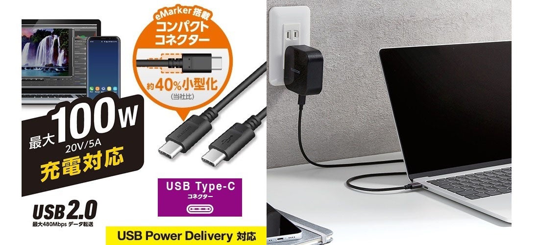 USB Power Delivery 100W充電に対応!従来品よりコネクターを約40%小型化したUSB-CコネクターのUSB2.0ケーブルを新発売
