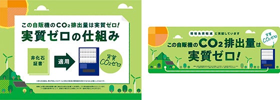 今回展開する「カーボンオフセット自販機」は、稼働に必要な年間消費電力量に相当する「FIT非化石証書※」を取得することで、その自販機は「再生可能エネルギー由来の電力」を使用したとみなされ、GHGの排出量を相殺することが可能になります。「カーボンオフセット自販機」に、「非化石証書を取得」や、「CO2排出量実質ゼロ」を掲げたPOPを掲出することで、地球環境負荷低減に貢献する自販機であることを訴求していきます。