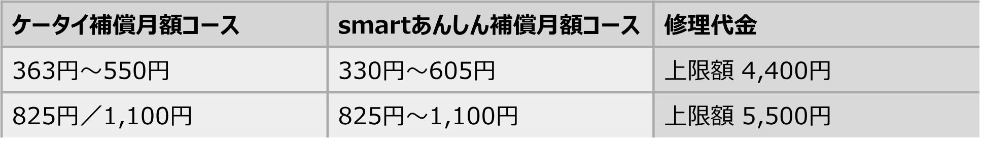 ・「ケータイ補償サービス」、「smartあんしん補償」のお客様の月額負担額により、交換費用が異な