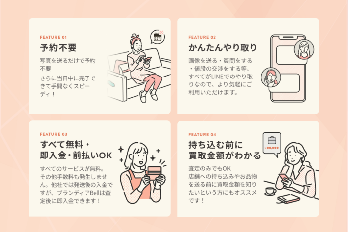 このたび新たに提供を開始する「写真買取サービス」β版はオンライン査定「ブランディアBell」サービスの一環として提供を開始し、実運用を重ねることでお客様が更に利用しやすくなるように改良を重ねて参ります。お客様はご予約なくLINEから写真を送るだけでバッグの買取査定が行え、LINE上でチャットによるご質問やご相談ができ、利用料は無料です。さらに写真査定後にお品物の買取契約が成立すればお品物をお送りいただく前にご指定の口座にお買取金額を入金いたします。宅配買取や店頭へのお持ち込みの前に概算金額を知りたいお客様にもご利用いただけます。