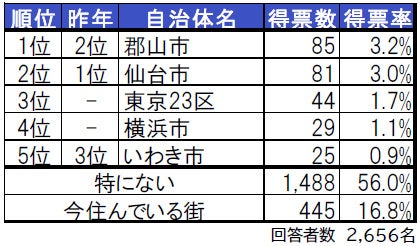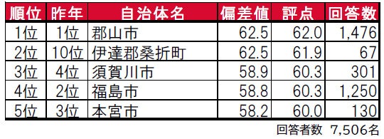 1位は昨年2位だった郡山市、2位は昨年1位の宮城県仙台市で、今年は順位が入れ替わる結果となっています。また、昨年は東北の自治体のみを対象として集計していましたが、今年は全国の自治体を対象とした結果、3位に東京23区、4位には神奈川県横浜市がランクインしています。