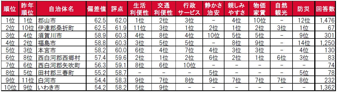 - 街の住みここちランキング2022<福島県版>自治体TOP10 因子別順位