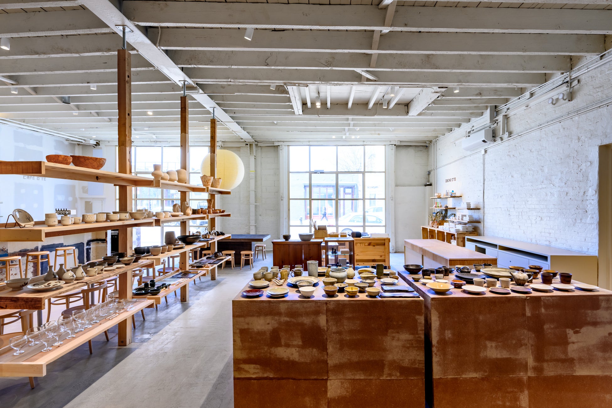 ストアデザインは既存スペースと同じくスキーマ建築計画が担当。50 Normanでは海外の施工現場においても日本国内で作るような繊細で質の高いデザインを再現することを目指し、日本で解体された古材や廃材を柱や什器の部材として再利用するほか、可能な限り日本で部材を加工し、体積を減らしてから海外へ輸送することで、日本から現地へ派遣した職人が短期間に組み立て・加工するというプロセスを採用しています。