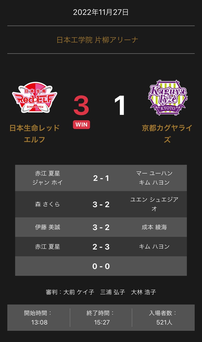 ノジマTリーグ 2022-2023シーズン 公式戦 11月27日に日本工学院 片柳アリーナ(東京都)にて開催された日本生命レッドエルフと京都カグヤライズの試合は、3-1で日本生命レッドエルフが勝利しました。