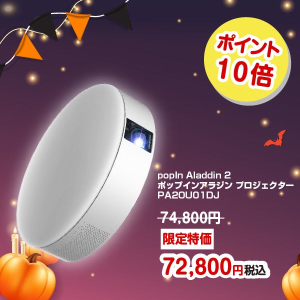 楽天市場「Show !t」では、大人気プロジェクター「popIn Aladdin 2」を数量限定、スペシャルプライスで販売中です。10/27(日)9:59までにご購入頂くと7,280円相当ポイント付与でお買い求め頂けますので大変お得です。こちらの商品は一度流通した未使用品を回収し、外装等を交換し、動作確認を行ったうえで再出荷した商品です。外観も新しく、動作も正常です。この機会をお見逃しなく。