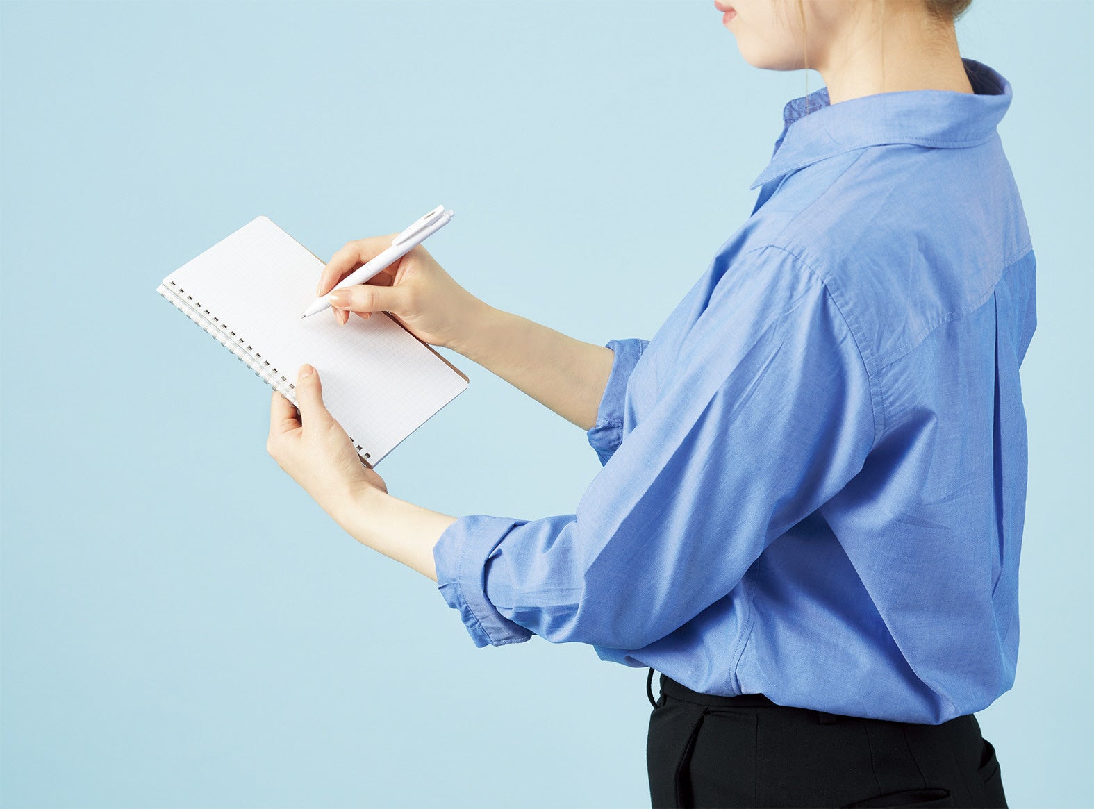 サイズは、それぞれコンパクトに持ち運べる大きさながら、しっかり書く派向けのスリムA5サイズ、メモ書き派向けのスリムB6サイズの2種類を揃えました。カラーはシーンを選ばず使いやすいベーシックなブラック、ホワイト、ブルーの3色をラインアップ。表紙に同系色のゴムバンドをあしらうことで、アクセントとなり引き締まった印象となっています。