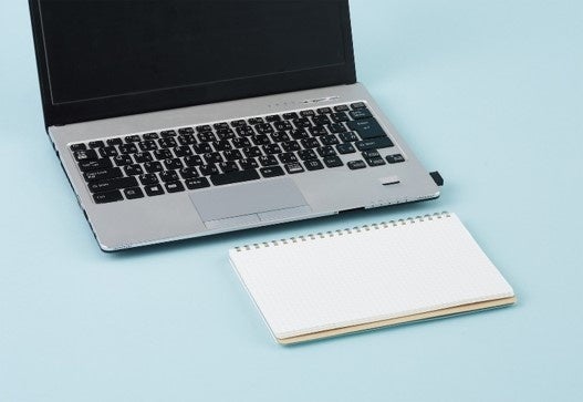 外出時やオフィスの移動シーンで邪魔にならず、持ち歩きやすいスリムA5サイズとスリムB6サイズを採用しています。折りたたむとPCの手前のスペースにも収まり省スペースに使えるスリムなサイズです。また、ウラ表紙は厚手でコシのある板紙なので、折り返しても書きやすくなっています。