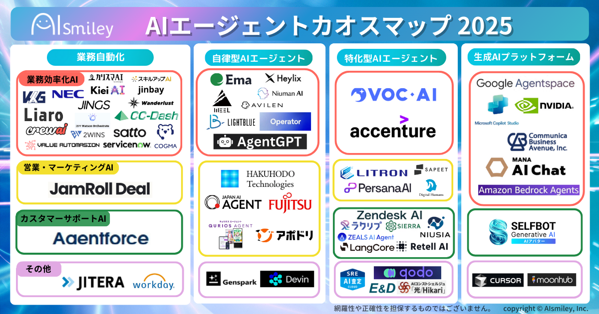 AIエージェントカオスマップは、AIエージェントサービスを体系的に分類し、各企業が自社に最適な製品を選びやすくすることを目的としたカオスマップです。「自律型AIエージェント」「業務自動化」「生成AIプラットフォーム」「特化型AIエージェント」の4カテゴリに分類、それぞれをカオスマップとしてマッピングしております。