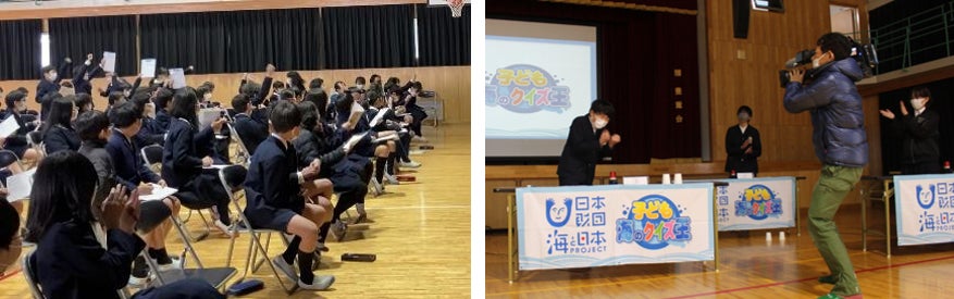 まずは、順番に名前を呼ばれた児童がそれぞれ早押しボタンを押して練習!決勝戦へ向けた緊張感が伝わります。海を身近に感じられる問題が次々と繰り出されました。テレビ番組のような問題を読み終わる前に早押し回答・正解が続く白熱した闘いに、観覧児童も前のめりになりながら応援していました。