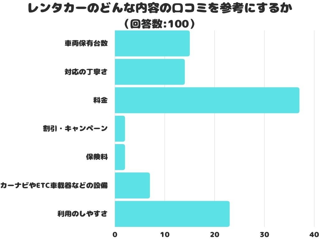 レンタカーのどんな内容の口コミを参考にするかをアンケートにて調査したところ、1位は「料金」でした。