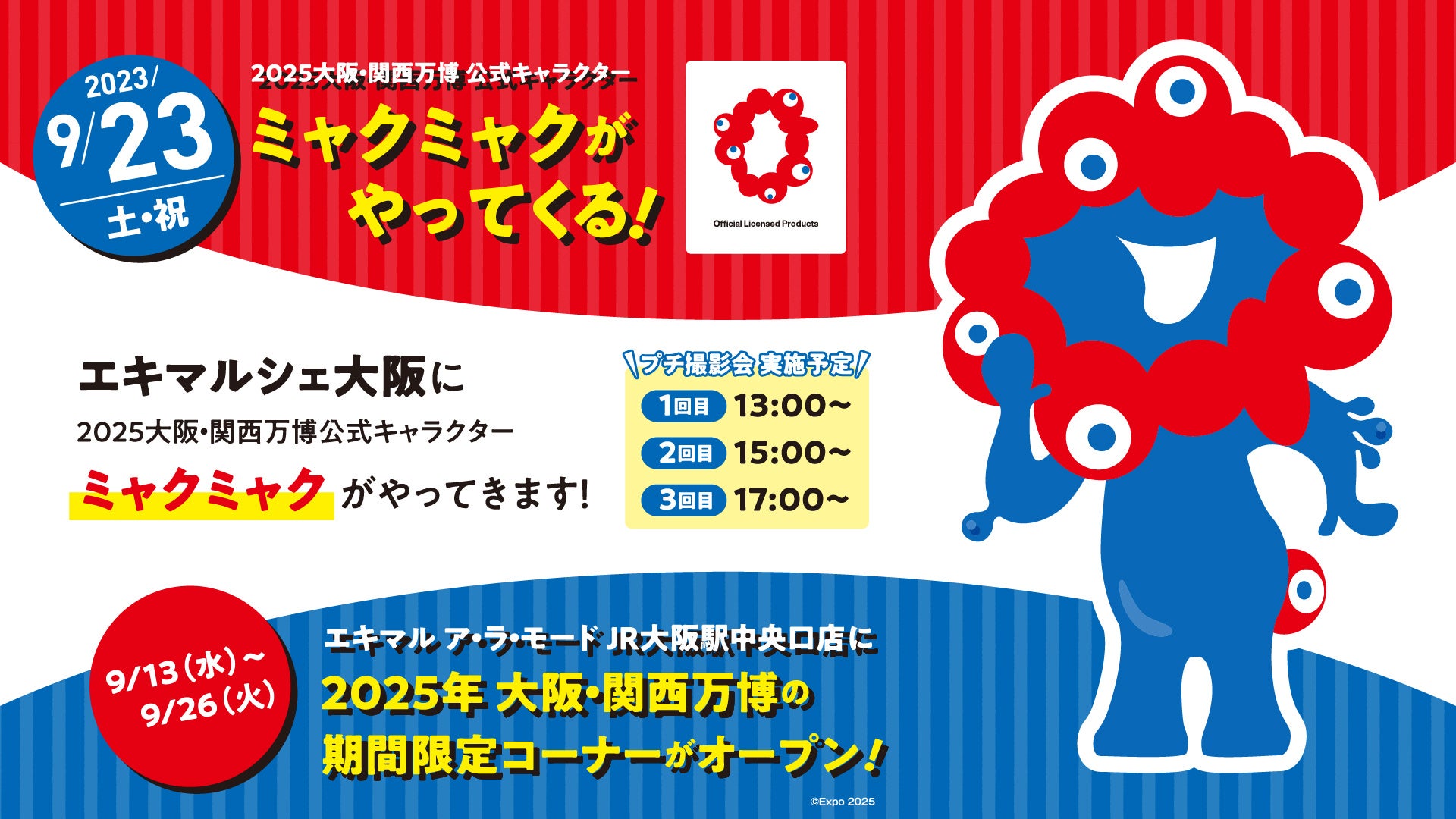 また、オープンに合わせて、「エキマルシェ大阪」に大阪・関西万博公式キャラクター「ミャクミャク」が遊びに来ます。撮影会を行いますので、期間限定コーナーと併せてぜひお越しください。