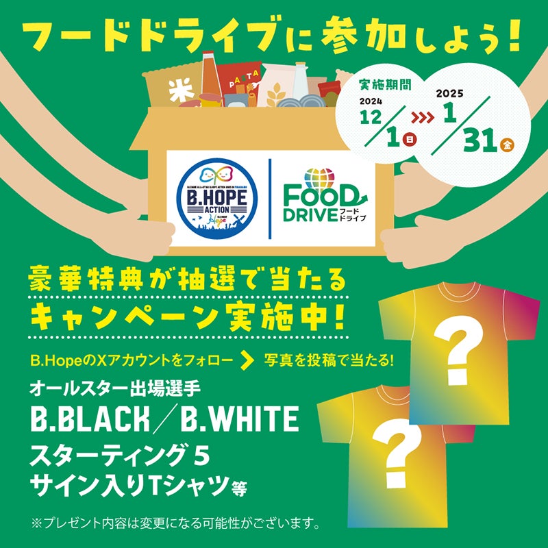 この度、「りそなグループ B.LEAGUE ALL-STAR GAME WEEKEND 2025 IN FUNABASHI」の開催にあたり、B.LEAGUEの社会的責任活動であるB.LEAGUE Hopeの活動としてB.Hopeフードドライブが実施されます。