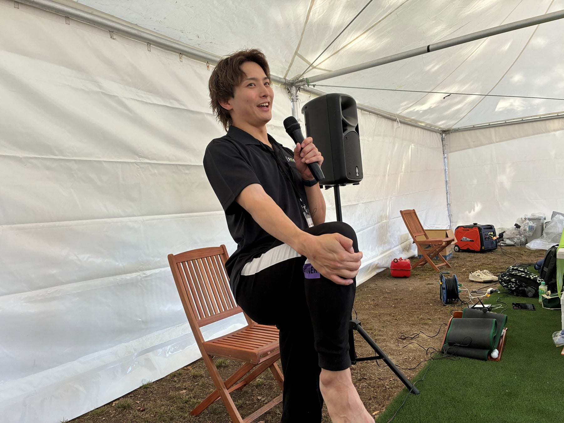 友人同士や家族連れなど多くの方が参加し、たろにぃさんの掛け声に合わせてスクワットやキックボクシングのアクションを楽しみながらおこなっていました。