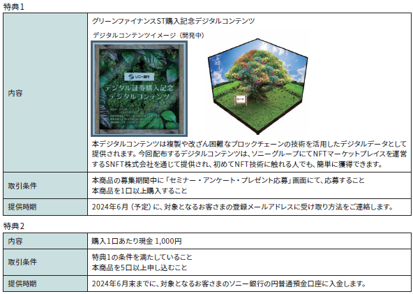 また、本商品の募集の取り扱いを記念して、本商品のご購入および募集期間中のアンケート回答で、NFTの技術を活用したソニー銀行のオリジナルのデジタルコンテンツをプレゼントします。さらに条件を満たしたかたに、購入口数に応じた現金をプレゼントします。