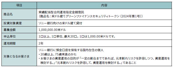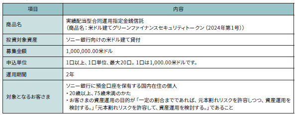 ソニー銀行株式会社(代表取締役社長:南 啓二/本社:東京都千代田区/以下 ソニー銀行)は、ソニー銀行のデジタル証券の第2号案件として「合同運用指定金銭信託受益権」(商品名:米ドル建てグリーンファイナンスセキュリティトークン(2024年第1号)、以下「本商品」)の募集の取り扱いを行いますのでお知らせいたします。