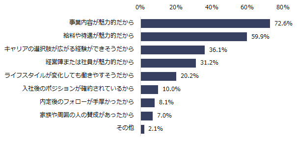 続けて内定承諾の決め手を伺うと、上位は「事業内容が魅力的だから」(72.6%)、「給与や待遇が魅力的だから」(59.9%)でした。