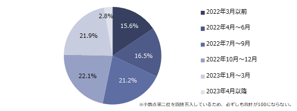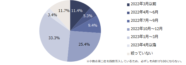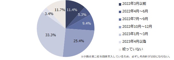 志望業界・志望企業を絞った時期について伺うと「2023年1月~3月」(33.3%)が最多でしたが、2022年12月までに絞った方が51.5%と半数を超えました。(2022年3月以前:11.4%、2022年4月~6月:5.3%、2022年7月~9月:9.4%、2022年10月~12月:25.4%)。就活の早期化がうかがえます。