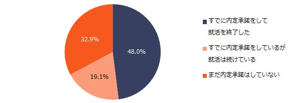 すでに内定を取得している方に内定承諾の状況を伺うと、「すでに内定承諾して就活を終了した」方は48.0%。内定を取得しながらも就活を継続している方が52.0%と半数以上になりました(すでに内定承諾をしているが就活は続けている:19.1%、まだ内定承諾はしていない:32.9%)。