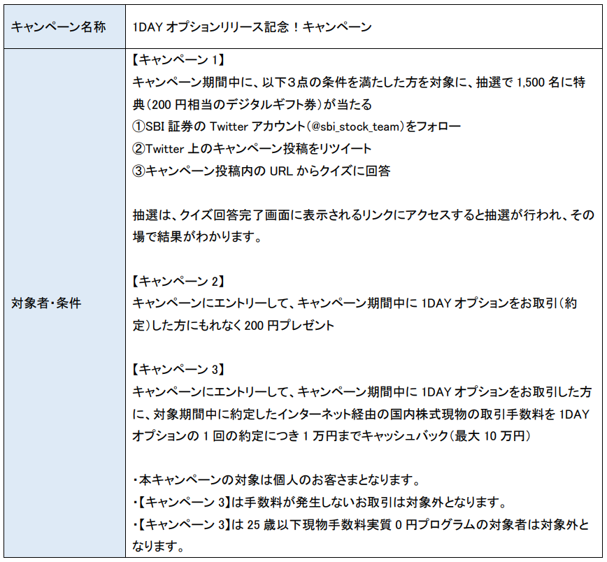 今回、「SBI証券株チーム(@sbi_stock_team) Twitter フォロー&リツイート後、クイズに回答して1,500名様に抽選で200円相当のデジタルギフト券が当たる!」「キャンペーン期間中に1DAYオプションをお取引(約定)した方に200円プレゼント!」「キャンペーン期間中に1DAYオプションを1回でもお取引(約定)されたお客さまに、同期間中に約定した国内株式の現物取引手数料を1DAYオプションの約定回数に応じて最大10万円までキャッシュバック!」の3つのキャンペーンを実施します。3つ全ての条件達成・当選した場合、最大で100,400円相当がもらえます。