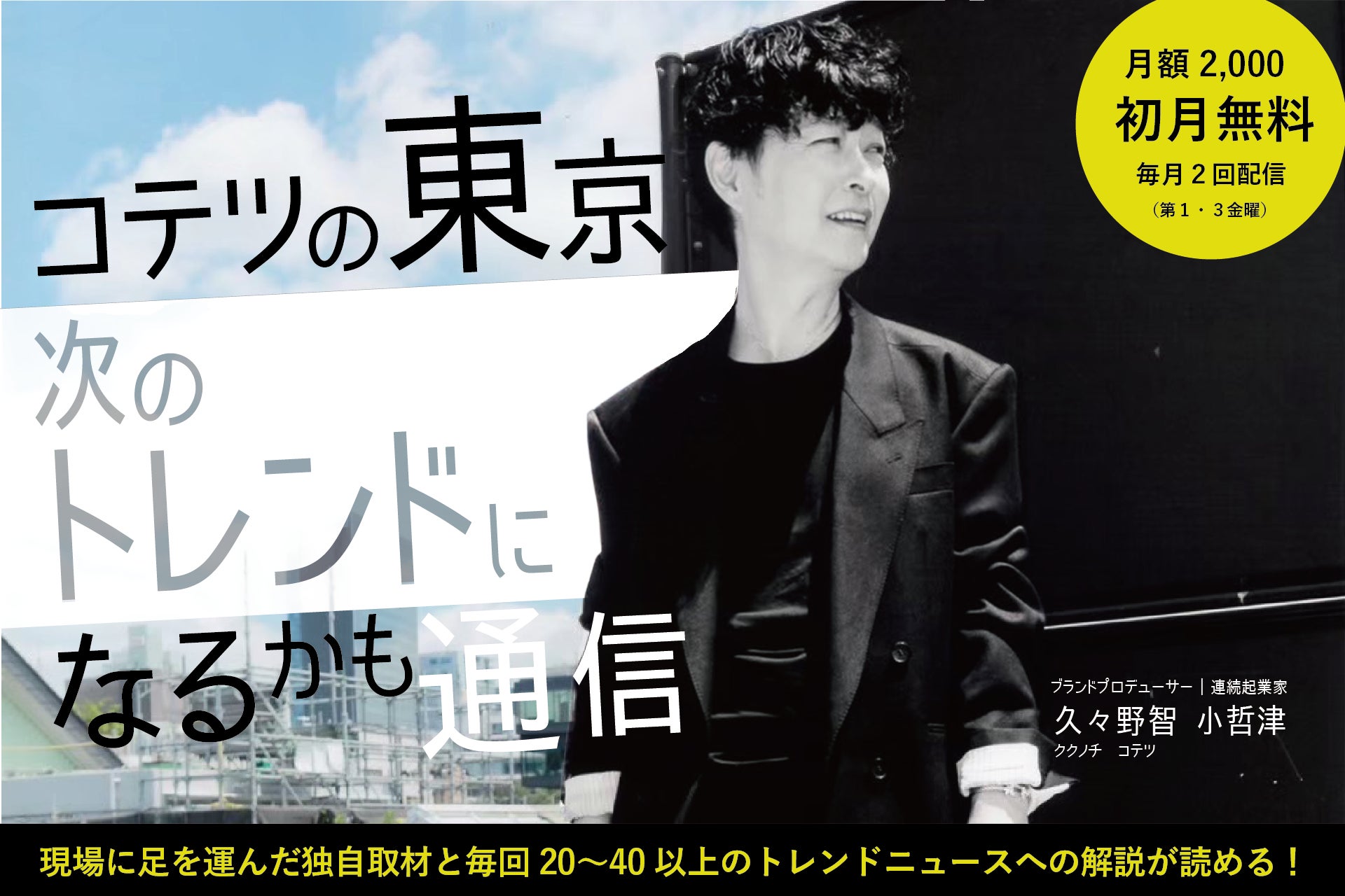 ブランドプロデューサーとして数多くの事業を成功に導いてきた久々野智小哲津(ククノチ コテツ)が、トレンドの種からビジネスアイディアのヒントをつかむ定期発行マガジン『東京、次のトレンドになるかも通信』を12/20(金)19時から本格始動します。