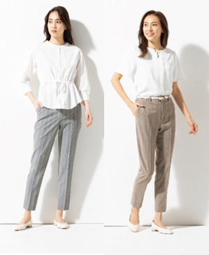 昨年も好評だった「360°キレイペグトップパンツ」はジャケット無しでも様になるデザインで、盛夏も着用しやすいよう、昨年より薄手の生地を採用。股上深めの設計で、ウエストのゴールドボタンのワンポイントアクセントがスタイルアップを叶えます。