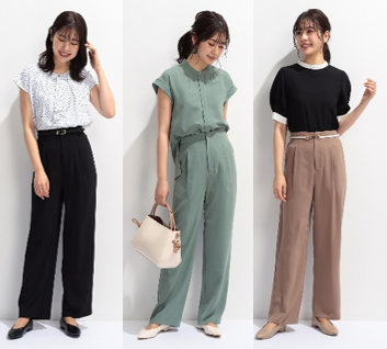 太すぎず細過ぎないシルエットの「360°キレイワイドパンツ」は、ウエスト・ポケット位置を高めに設定し、脚長・ヒップアップ効果があります。晩夏まで使えるカラー展開でご用意しております。