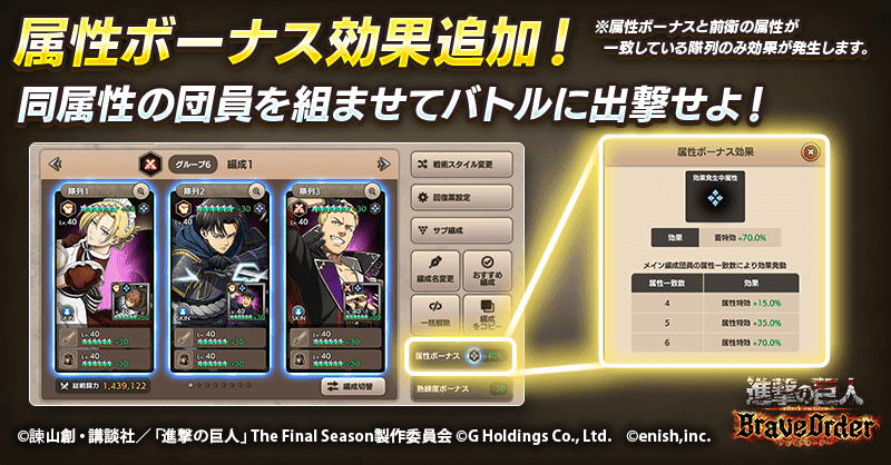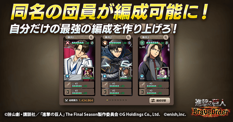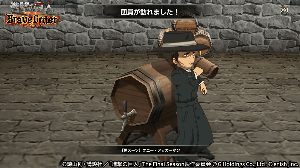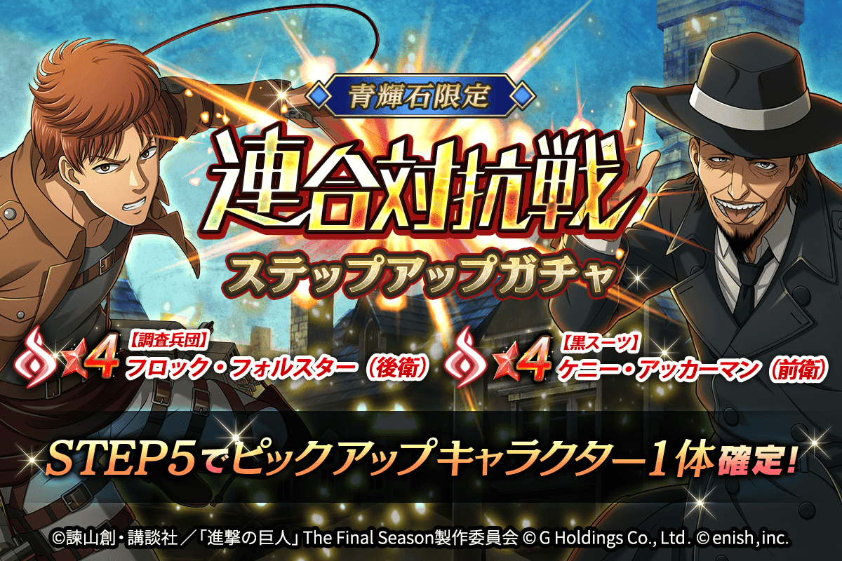 株式会社enish(本社:東京都港区、代表取締役社長:安徳 孝平、以下enish)は、アニメ『進撃の巨人』のスマートフォンゲーム最新作「進撃の巨人Brave Order」にて、12月7日(水)実装のVer1.13アップデートで巨人殲滅戦に新たな巨人が登場!また、連合対抗戦&殲滅戦キャンペーンも同時開催!さらに、本日より新登場の【黒スーツ】ケニー・アッカーマン、【調査兵団】フロック・フォルスターがピックアップされた「連合対抗戦ステップアップガチャ」も同時開催!その他、最新情報はゲーム公式サイト・ゲーム公式Twitterアカウントにて随時公開して行きますので、ぜひご覧ください。