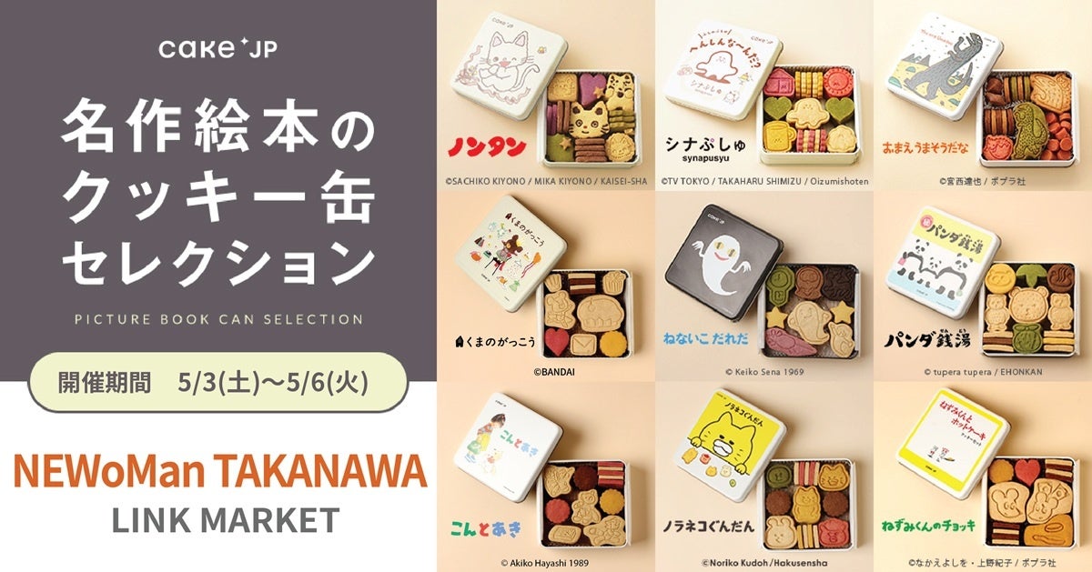 「名作絵本のクッキー缶セレクション by Cake.jp」は、百貨店やエキナカを中心に全国20箇所以上で開催し、連日多くのお客様にお越しいただいている大好評のポップアップストアです。今回ポップアップストアが出店する「NEWoMan TAKANAWA LINK MARKET」は、ニュウマン高輪がプロデュースする、あらゆる個性が「LINK」し日常を彩るマーケット。3回目となる今回は、アートな空間で遊ぶワークショップや多様な体験型イベント、食や物販・雑貨など様々なショップが集うマーケットです。今年のゴールデンウィークは、大人だけではなく、子どもだけでもなく、大人も子どもも楽しめる300mの滞在空間で是非お過ごしください!