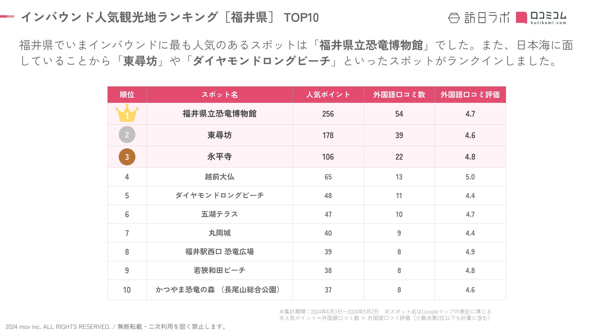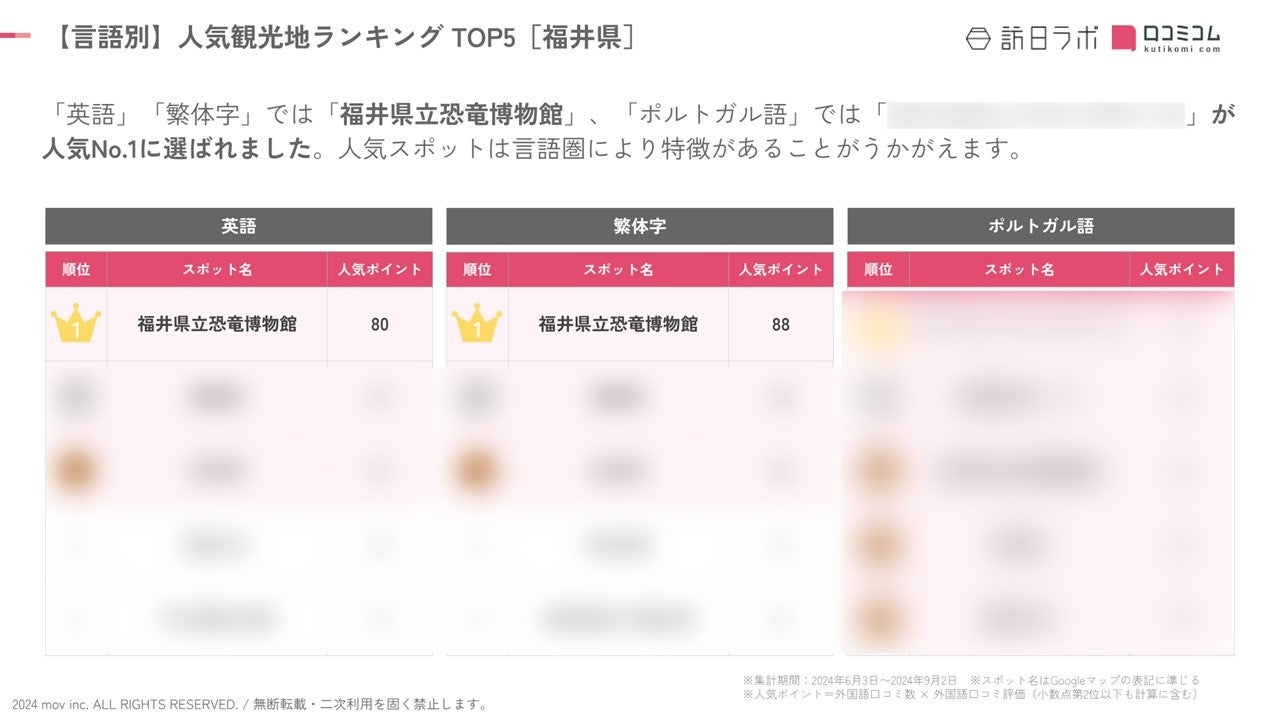 【独自調査】2024年最新:外国人に人気の観光スポットランキング[福井県編]1位は「福井県立恐竜博物館」!| インバウンド人気観光地ランキング #インバウンド #MEO