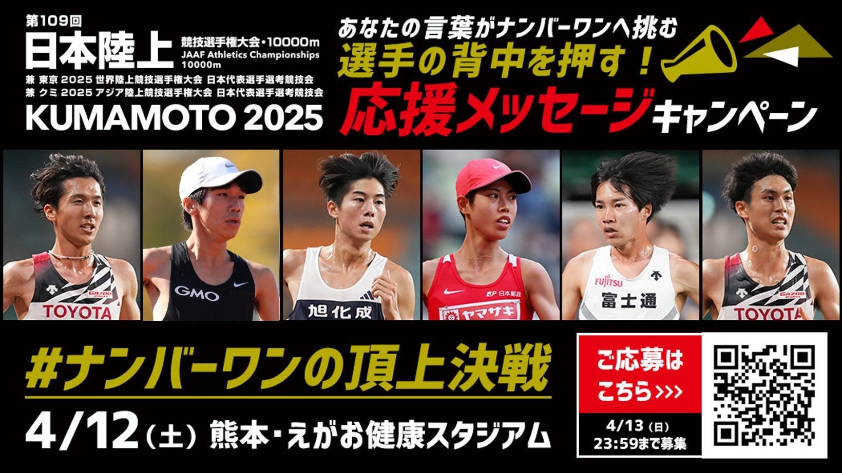 4月12日(土)熊本・えがお健康スタジアムにて「第109回日本陸上競技選手権大会・10000m」を開催いたします。この度出場選手への応援メッセージを大募集!