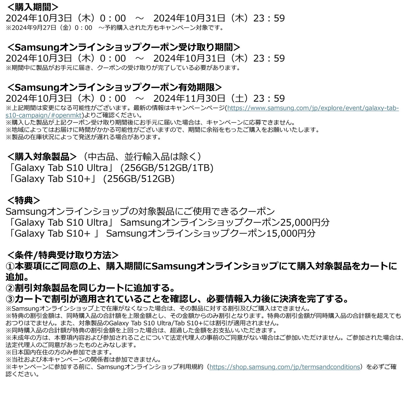 ※上記期間は変更になる可能性がございます。最新の情報はキャンペーンページ(https://www.samsung.com/jp/explore/event/galaxy-tab-s10-campaign/#estore)よりご確認ください。