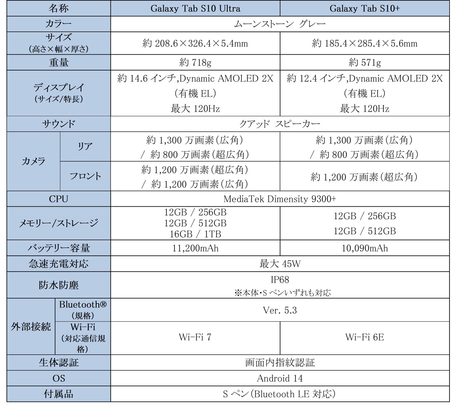 <主な仕様 : 「Galaxy Tab S10シリーズ」 >