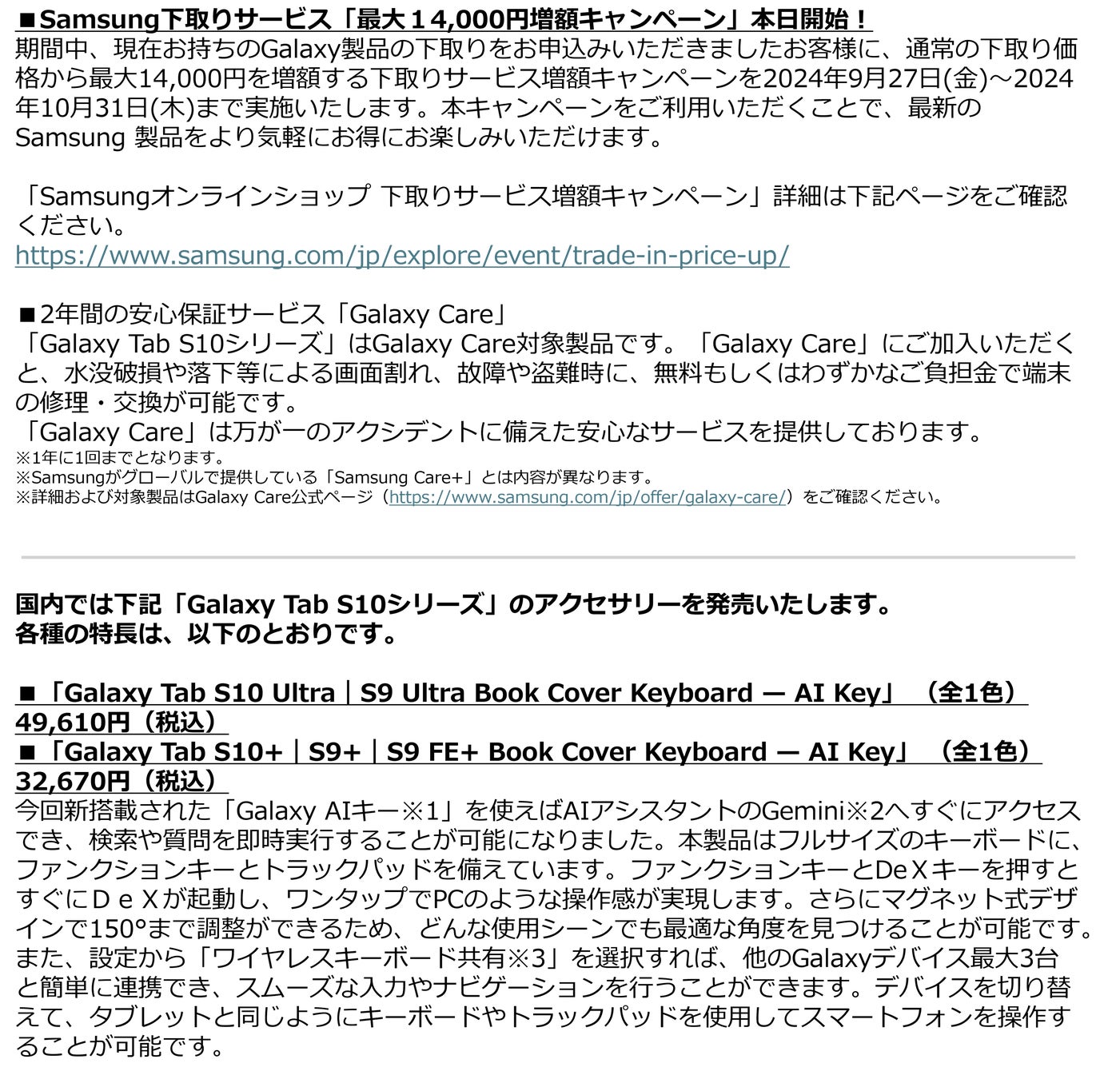サムスン電子ジャパン株式会社は、生産性と創造性を実現するAI対応最新タブレット「Galaxy Tab S10 Ultra」、「Galaxy Tab S10+」および専用の純正アクセサリーの国内発売を決定いたしました。各製品は、Samsungオンラインショップ(https://www.samsung.com/jp/offer/)、世界最大級のショーケース「Galaxy Harajuku」(東京・原宿)、「Galaxy Studio Osaka」(大阪・なんば)、アマゾンジャパン合同会社(以下Amazon)、主要ECサイト、家電量販店にて、2024年9月27日(金)より予約受付※1を開始し、2024年10月3日(木)より販売を開始※2いたします。