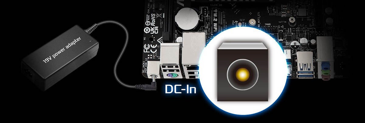 19V電源アダプタに対応したDC-Inジャックを搭載しておりPC用電源ユニットを必要としないため、コンパクトな筐体をお使いいただくことが可能です。