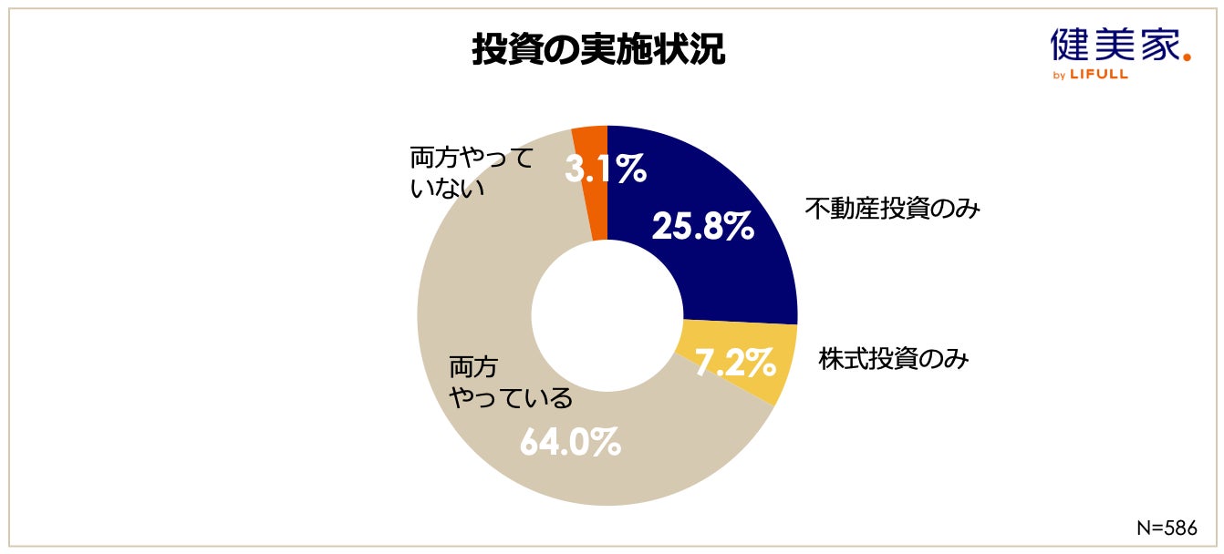 「現在、不動産投資と株式投資を行っているか(現在所有しているかどうか)」を尋ねたところ、「両方やっている」が64.0%に達しました。
