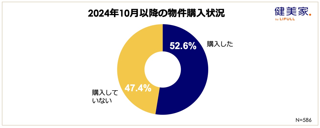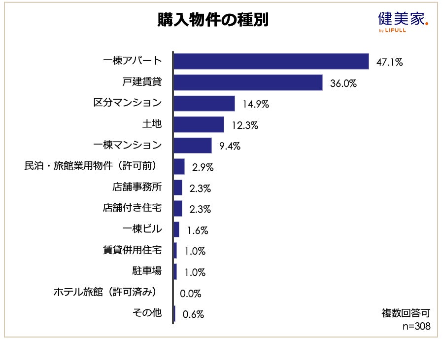 2024年10月以降に物件を購入したか尋ねたところ、「購入した」が52.6%で半数を超えました。購入した物件種別は、「一棟アパート」が最多の47.1%で、「戸建て賃貸」が36.0%で続きました。