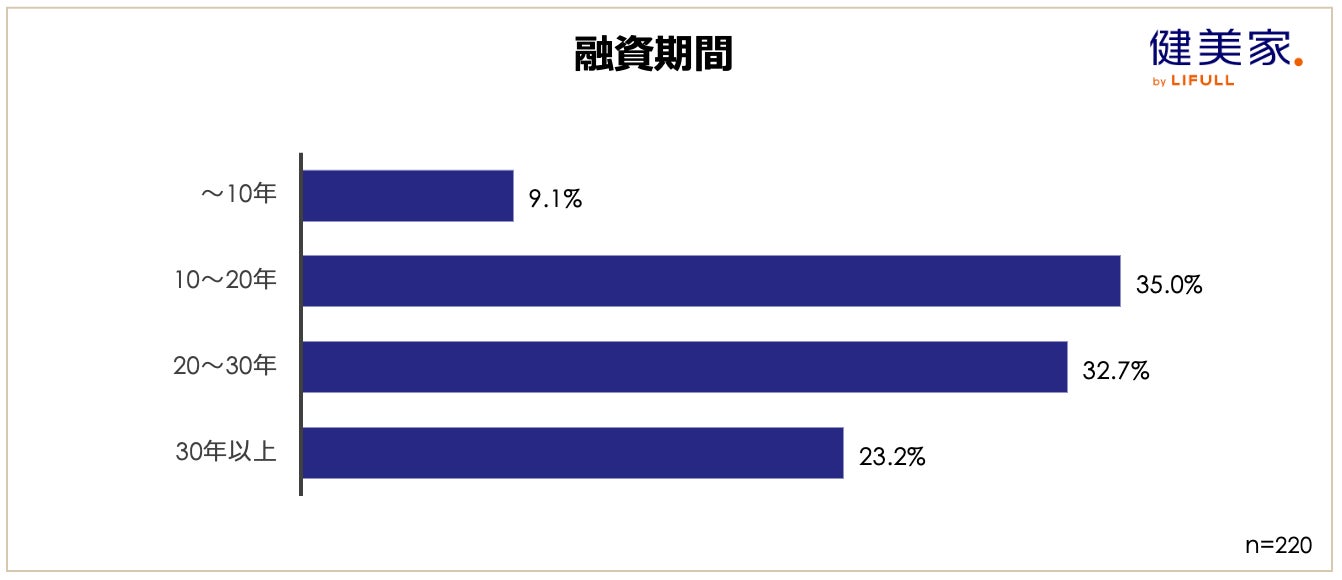 「融資を活用した」と回答した方に融資期間はどのくらいかを尋ねたところ、2024年4月は「20~30年」が35.4%で最多でしたが、今回の調査では「10~20年」が35.0%で最多となりました。