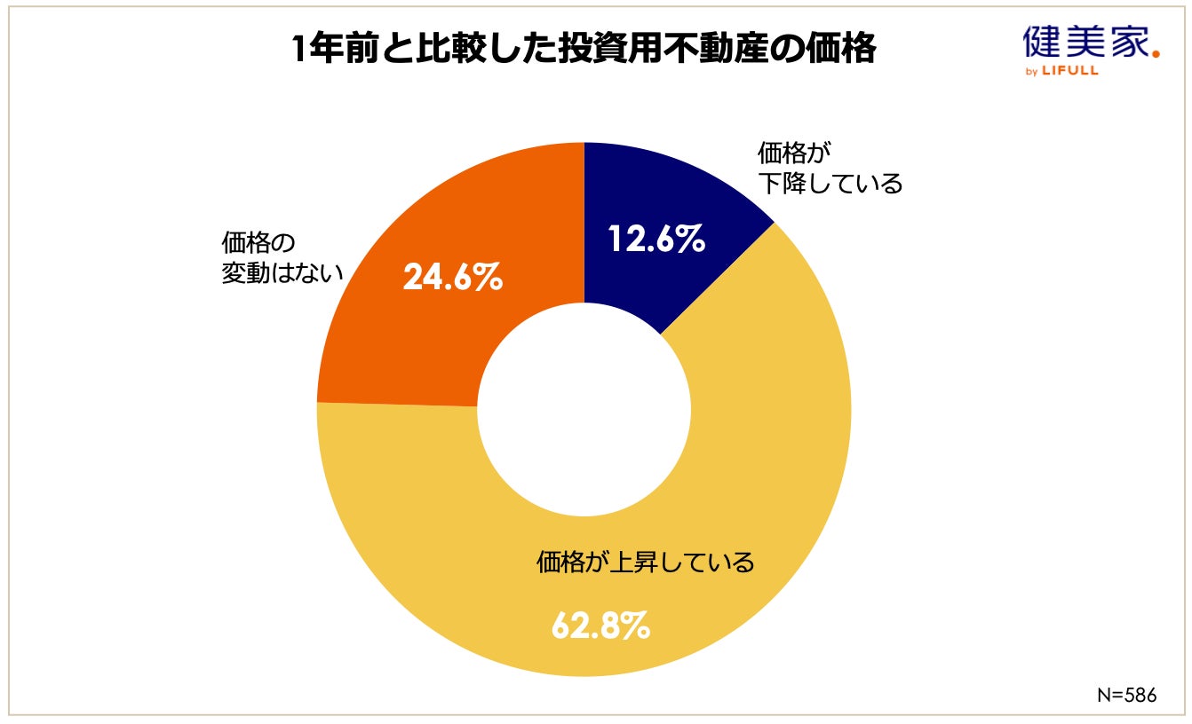 現在の投資用不動産の価格について、1年前と比べるとどうか尋ねたところ、「価格が上昇している」が最多で62.8%でした。2021年4月以降「価格が上昇している」が最多の状況が続いています。