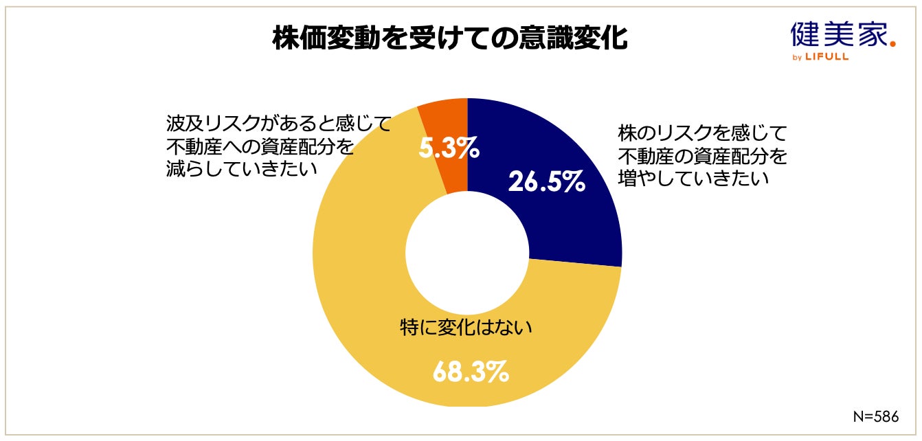 また、2025年4月の株価変動を受けての意識を尋ねたところ「特に変化はない」68.3%、「株のリスクを感じて不動産の資産配分を増やしていきたい」は26.5%となりました。