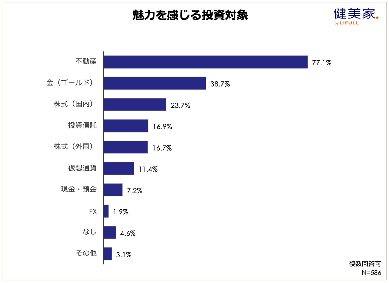 さらに、株価変動を受けて相対的に魅力を感じる投資対象は、「不動産」が77.1%で最多、次いで「金(ゴールド)」が38.7%という結果でした。