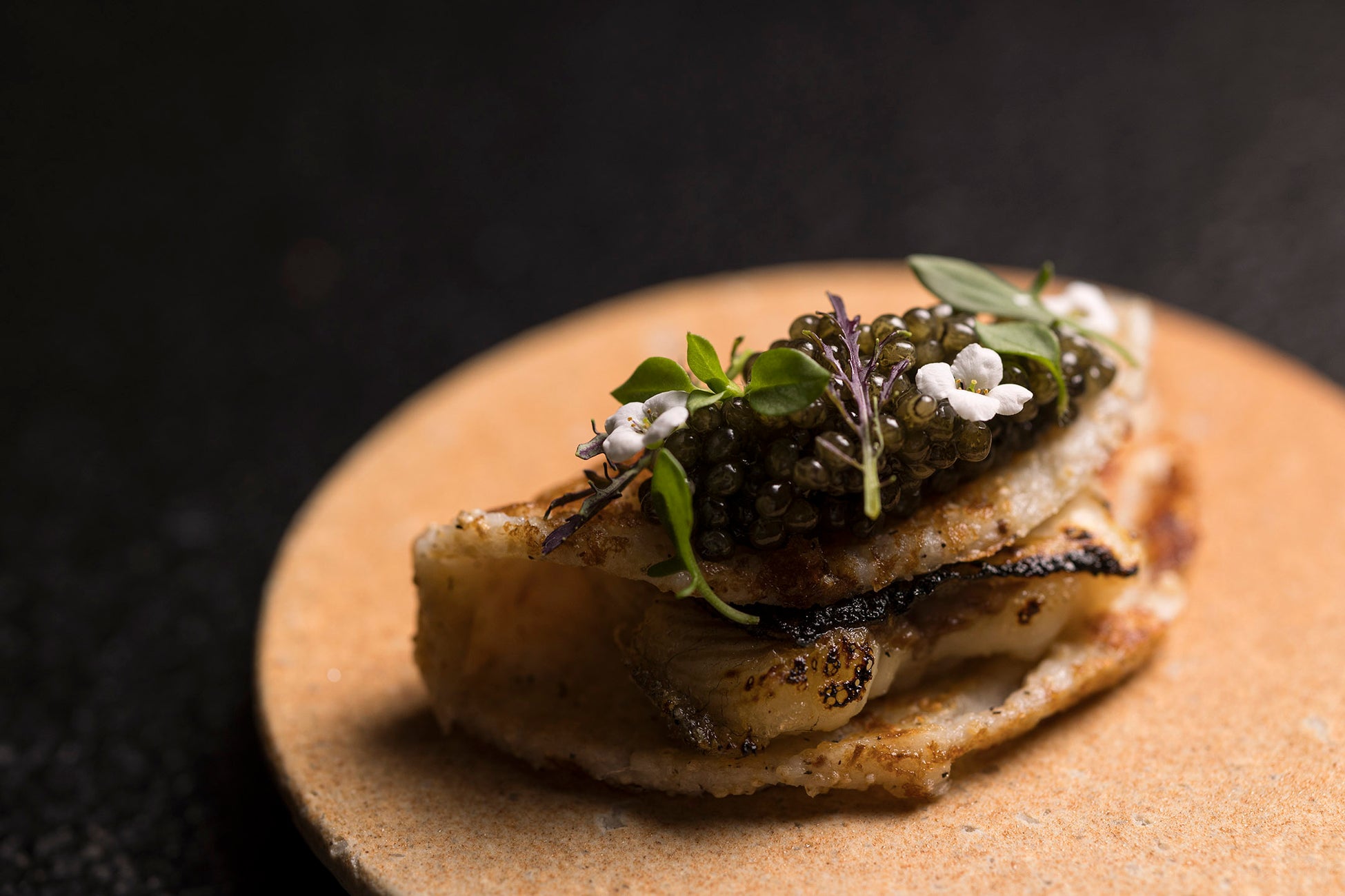 本コースは、江戸料理に着目した一皿から始まります。春限定メニューでは江戸の四大名物料理(*1)から「うなぎ」と「蕎麦」を取り入れ、フランス料理の調理技法を用いてアレンジしました。春の訪れを告げる新玉ねぎと蕎麦粉で作るとらやき風の生地に、炭火で焼き上げたうなぎの白焼きを挟み、キャビアを贅沢にのせています。芳ばしい香りと新玉ねぎの強い甘みを、キャビアの上質な塩味がまとめる、気品あふれる一品です。この一品を皮切りに江戸から日本各地へと味覚と文化が広がっていきます。