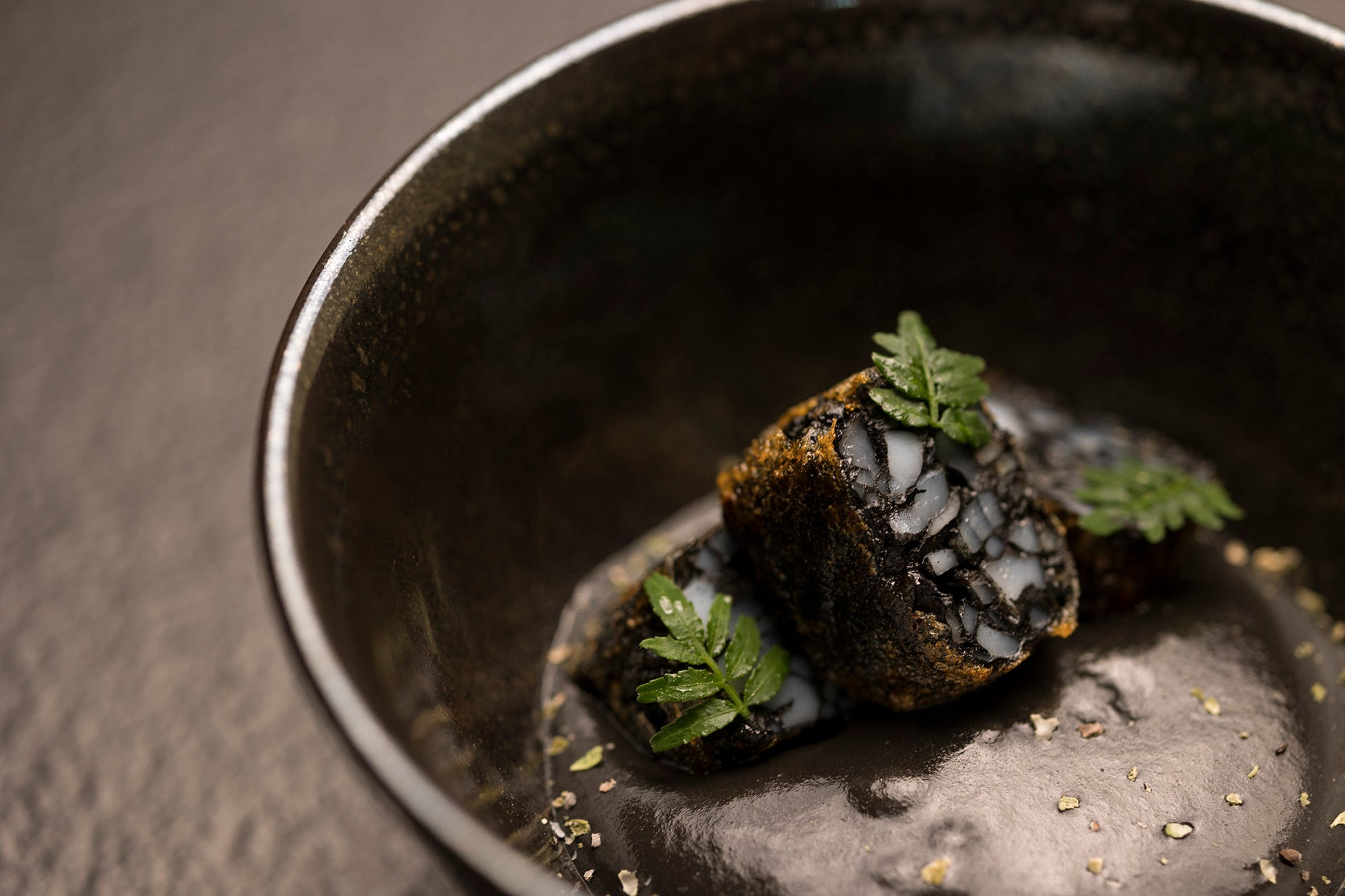 「黒つくり」とはスルメイカの身を細かく切り、イカ墨や肝臓を混ぜ合わせて熟成させた塩辛の一種です。お酒のつまみに最適な富山県の珍味と言われています。春キャベツの甘みがほのかに香るエチュベ(*2)を隠すように、イカ墨と内臓を合わせた黒つくりのソースを被せ、イカをライスペーパーで包み焼き上げた、ブータンノワール風の仕立てで合わせました。塩味と旨味がほどよく合わさった塩辛を彷彿とさせるソースとともに、木の芽のスパイシーな香りや、イカのコリコリとした食感も楽しめる春らしい一品です。