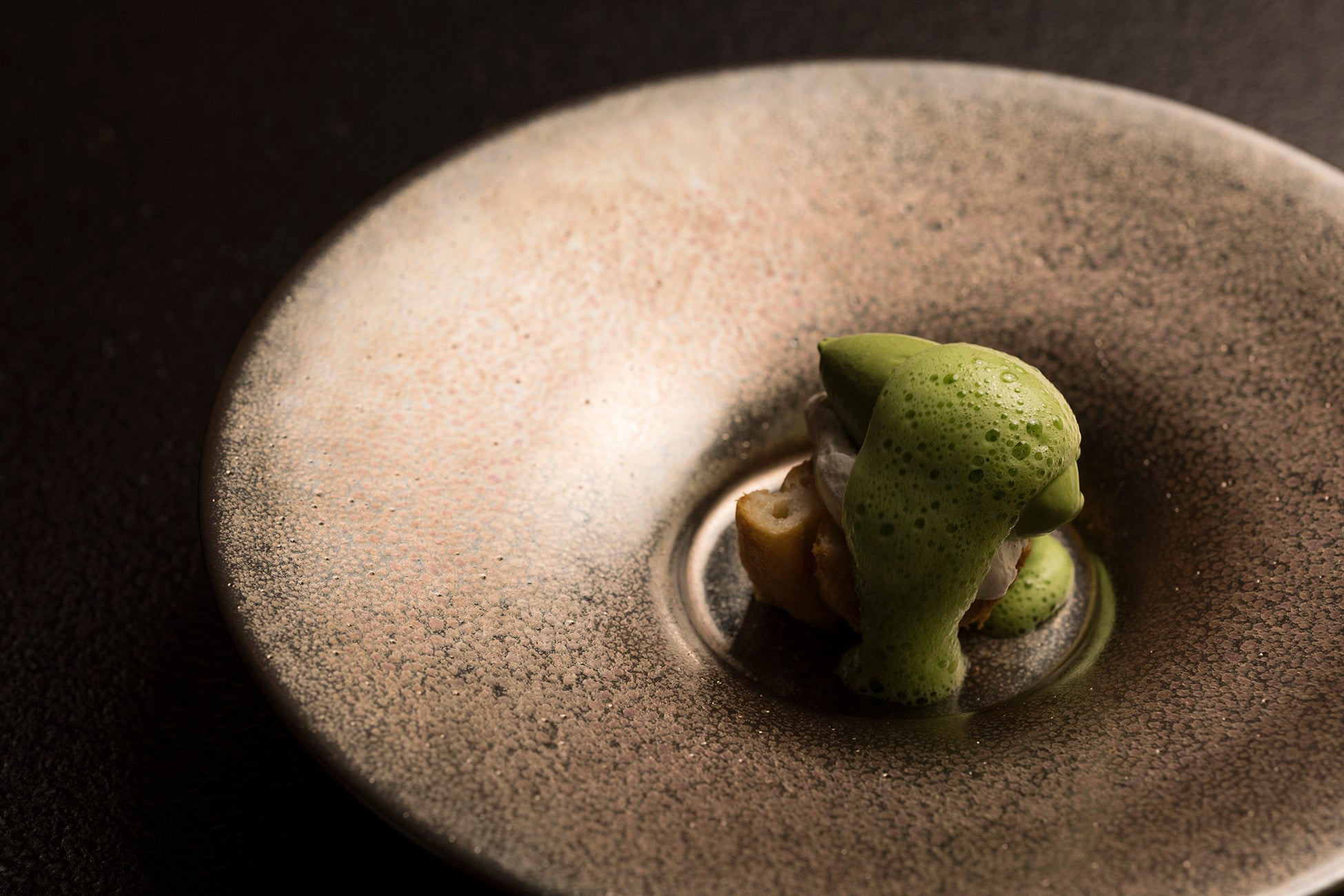 熊本の郷土菓子「いきなり団子」を、フランスの伝統菓子ババ・オ・ラム風にアレンジしたデザートです。火入れした干し芋を、甘酒を練りこんだ求肥で包み、ババの生地で焼き上げました。瑞々しい若葉が薫るよもぎのエミュルション(*3)とアイスクリームを添え、最後に樹木を連想させる香りのジンをたっぷりと掛けた一皿です。口の中に広がる洋酒の風味と山菜の苦み、芋のまろやかな甘みの、重層的な味わいを楽しめます。