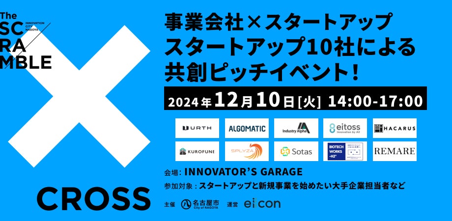 日本最大級のオープンイノベーションプラットフォーム「AUBA(アウバ)」を運営する株式会社eiicon(エイコン 本社所在地:東京都文京区後楽、代表取締役社長:中村 亜由子、以下「eiicon」)は、名古屋市とともに運営するイノベーション拠点を核とした共創促進事業「The SCRAMBLE」 において、2024年12月10日(火)、名古屋地域でのスタートアップと事業会社の共創促進に向けたオープンイノベーションイベント『CROSS』の開催、ピッチ登壇企業10社とのマッチングを希望する愛知・名古屋エリアの事業会社の募集を開始することをお知らせします。