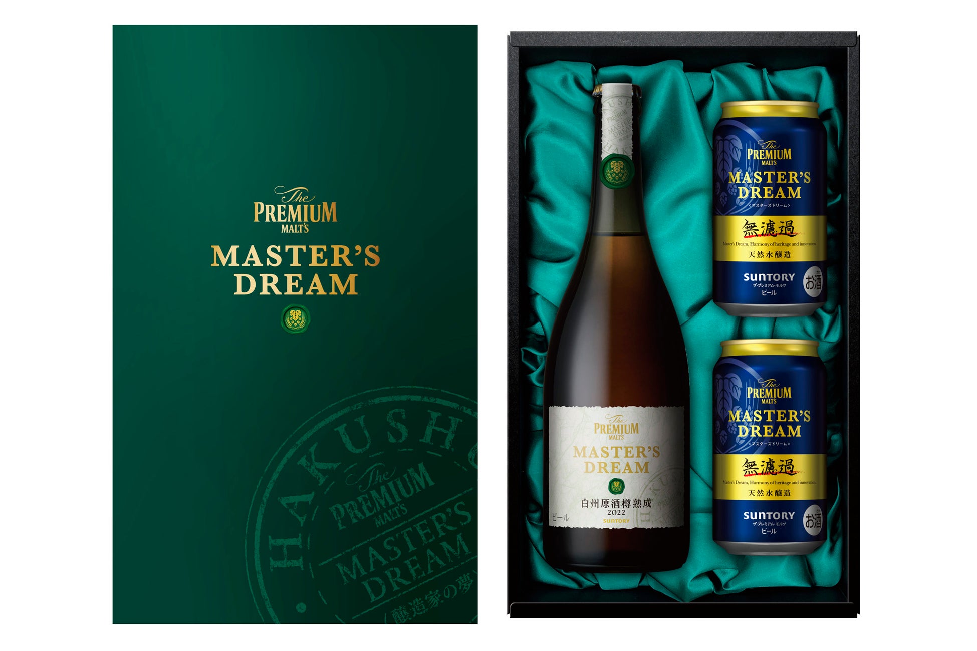 今回は、サントリーシングルモルトウイスキー「白州」に使用した木樽で熟成させた「同 マスターズドリーム〈白州原酒樽熟成〉」が新登場。「同 マスターズドリーム〈白州原酒樽熟成〉」(715ml×1本)と「同 マスターズドリーム〈無濾過〉」(350ml×2本)を詰め合わせたセットを抽選販売します。