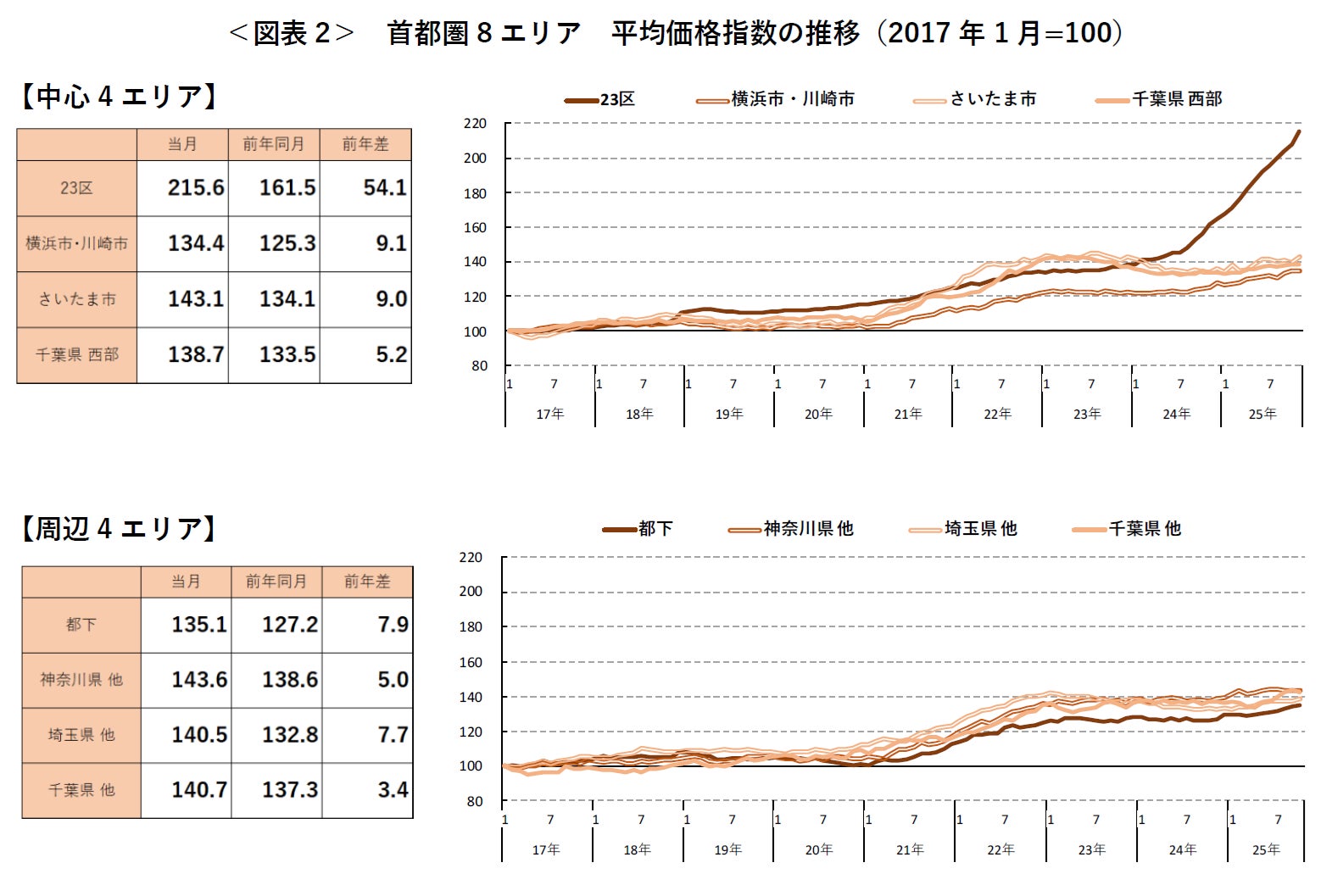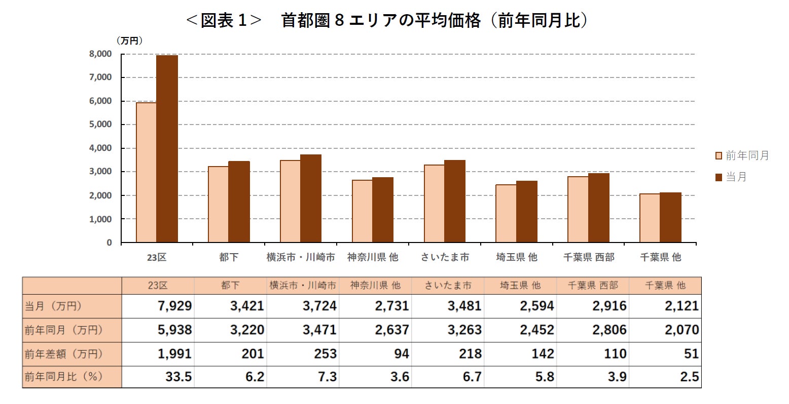 首都圏の1戸あたり平均価格は、前月比、前年同月比ともに上昇した。