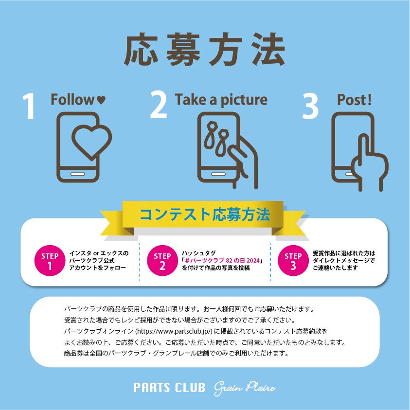 パーツクラブ82の日コンテスト2024開催!ハンドメイドアクセサリーの作品を募集中です。受賞作品には店舗で使える商品券をプレゼント!